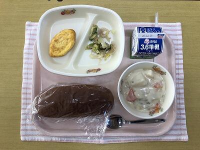黒パン、牛乳、トマトオムレツ、大根とツナのサラダ、ベーコンチャウダー