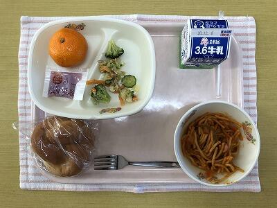 小さい米粉パン、牛乳、いちごジャム、イタリアンサラダ、スパゲッティナポリタン、みかん