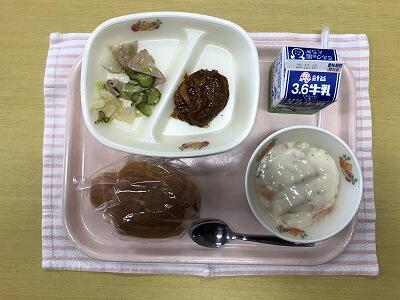 バターロール、牛乳、ハンバーグのデミソースかけ、ハムと大根のマリネ、ホワイトシチュー