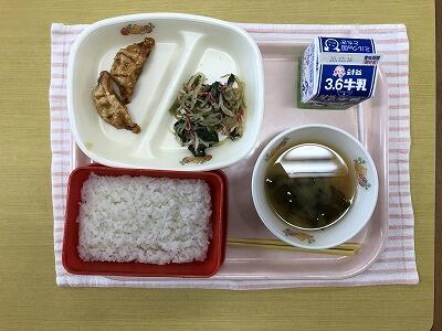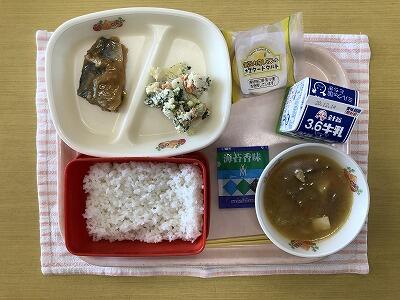 ごはん、牛乳、のり香味、さばの味噌煮、ポテトほうれん草サラダ、豚汁、レモンカスタードタルト