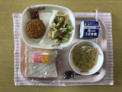 食パン、牛乳、りんご&マーガリン、メンチカツ・ソース、花野菜とパスタのサラダ、洋風卵スープ
