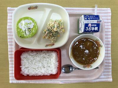 カレーライス、牛乳、ささみマヨサラダ、マスカットゼリー