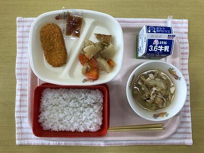 ごはん、牛乳、野菜コロッケ、豚肉と大根の煮物、さつまいも汁