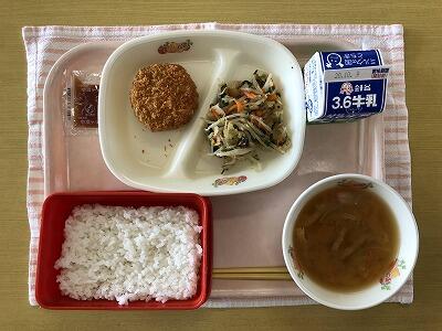 ごはん、牛乳、すき焼き風コロッケ・ソース、梅かつお和え、五目みそ汁