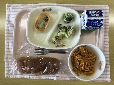 小さいアップルパン、牛乳、ホワイトグラタン、カラフルサラダ、スパゲティボロネーゼ