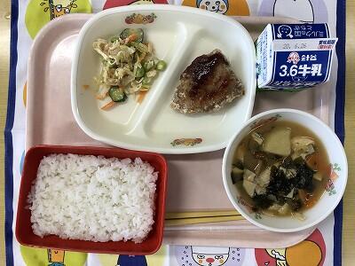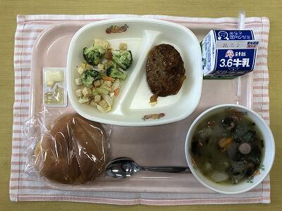 米粉パン、牛乳、はちみつ&マーガリン、ハンバーグデミソースかけ、シーザーサラダ、野菜のポトフ