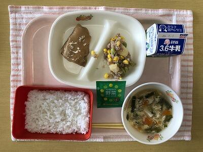 ごはん、牛乳、ふりかけ、さばの味噌煮、じゃがいもそぼろ煮、にら玉汁