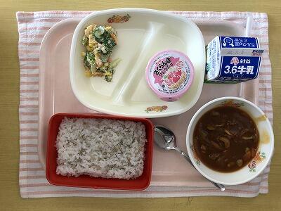 ハヤシライス(大麦ごはん)、牛乳、スイートコーンのサラダ、さくらんぼフレッシュ
