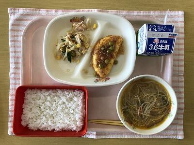 醤油ラーメン、牛乳、春巻き、中華風わかめサラダ、レモンカスタードタルト