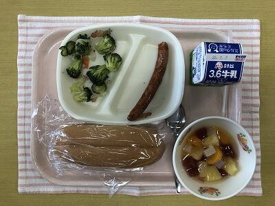 ホットドック、牛乳、ウインナー、野菜いっぱいサラダ、フルーツポンチ