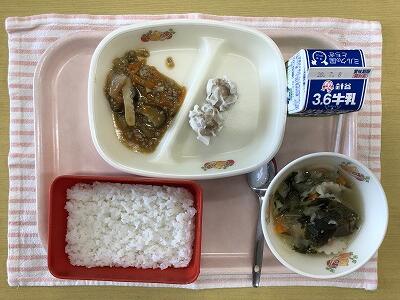 ごはん、牛乳、モロのケチャップ和え、切干し大根とさきいかのサラダ、湯葉となめこの味噌汁