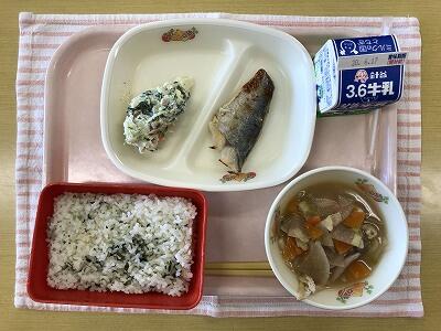 わかめごはん、牛乳、さわらの西京焼き、ポテトほうれん草サラダ、せんべい汁