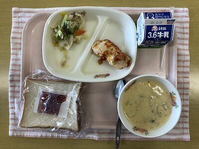 ミルク食パン、牛乳、いちごジャム、鶏肉のトマトソース、ブロッコリーとツナのサラダ、コーンポタージュ