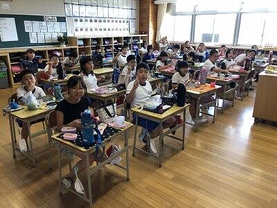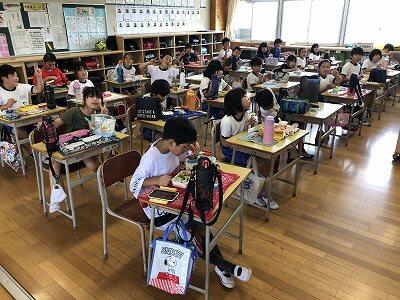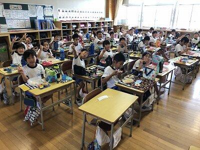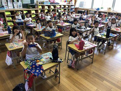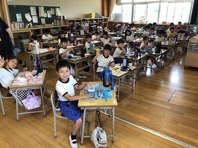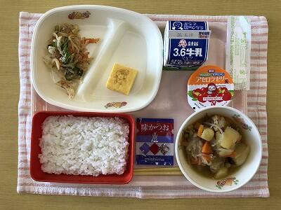 ごはん、牛乳、ふりかけ、県産厚焼き玉子、たくあん和え、カレー風肉じゃが、アセロラゼリー