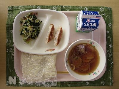 しょうゆラーメン、牛乳、ぎょうざ2ケ、青菜ナムル、しょうゆラーメンのスープ
