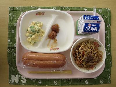 セルフたまごサンド(コッペパン)、牛乳、ミートボール2ケ、たまごサンドの具、いか入り焼きそば