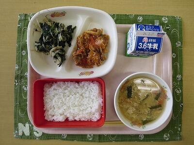 ごはん、牛乳、ポークチャップ、磯香和え、かんぴょうのかき卵汁