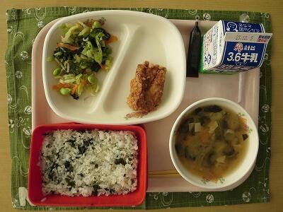 わかめごはん、牛乳、ミルメークコーヒー、鶏のから揚げ、かいそうサラダ、ゆばのみそ汁