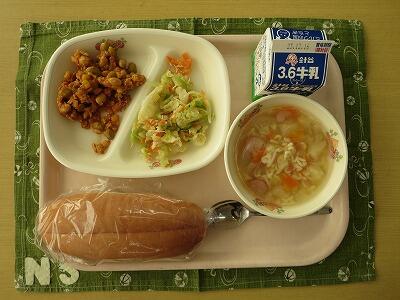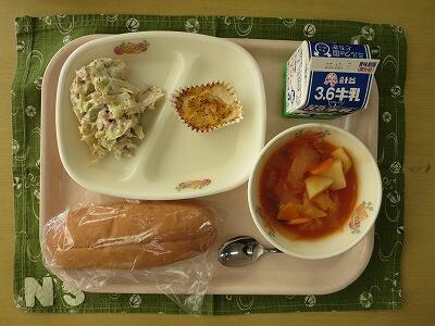 カレービーンズドック、牛乳、カレービーンズドックの具、チキンのイタリアンサラダ、ABCスープ