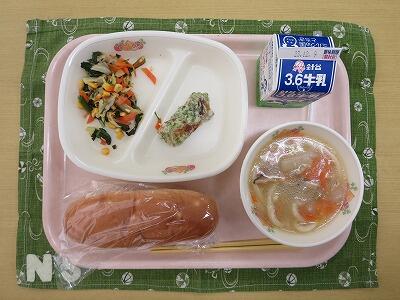 小さいオレンジパン、牛乳、ちくわの磯辺揚げ、ほうれん草のおかか和え、チャンポン風煮込みうどん