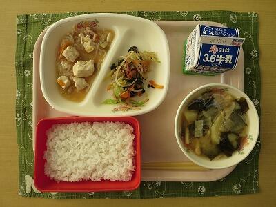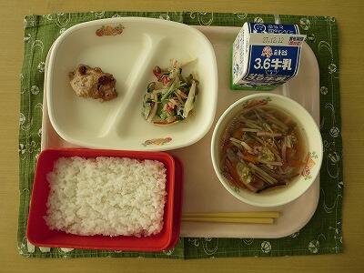 ごはん、牛乳、鶏肉のみそ焼き、水菜ときのこの和え物、沢煮椀