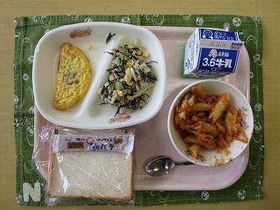食パン、キャラメルパテ、牛乳、ほうれん草オムレツ、豆とひじきのサラダ、トマトソースペンネ