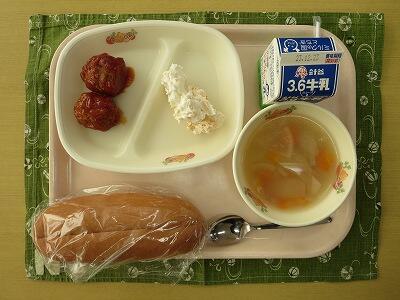 フルーツサンド(コッペパン)、牛乳、ミートボール、野菜のポトフ