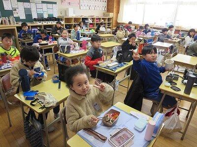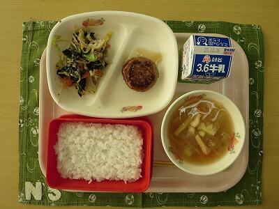 ごはん、牛乳、いわしのハンバーグ照り焼きソース、磯香和え、五目みそ汁