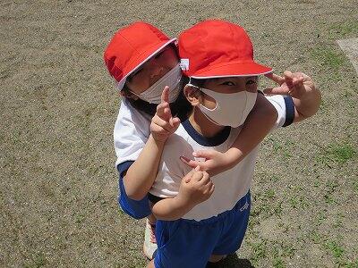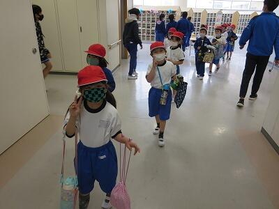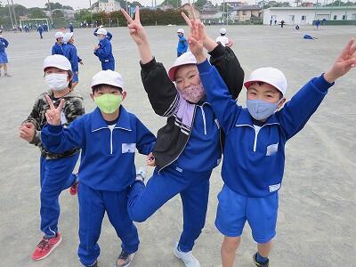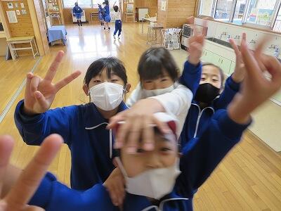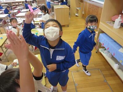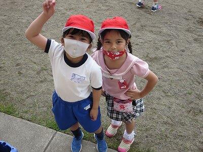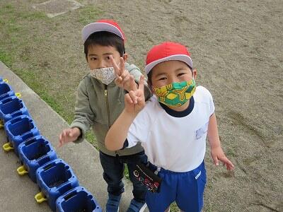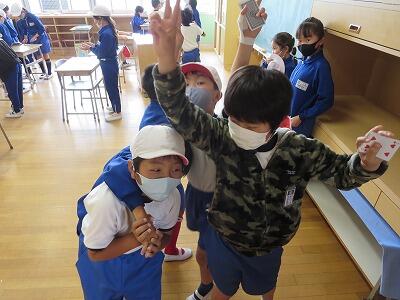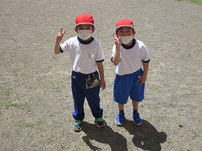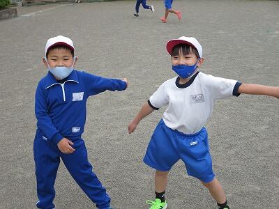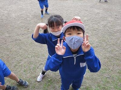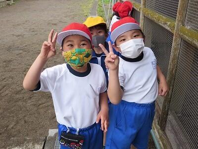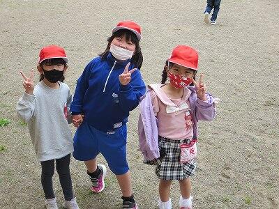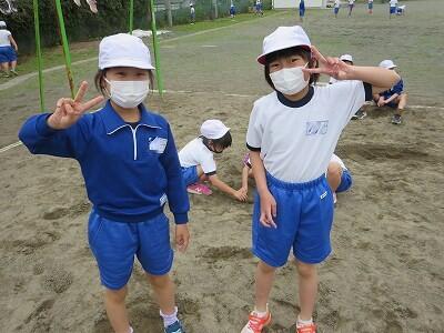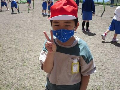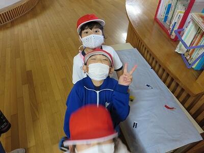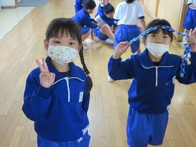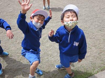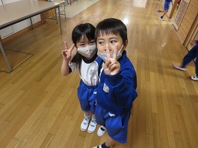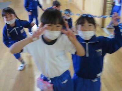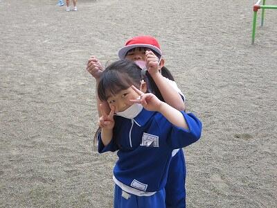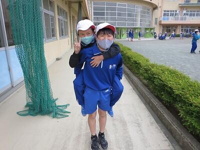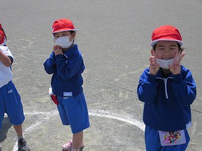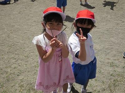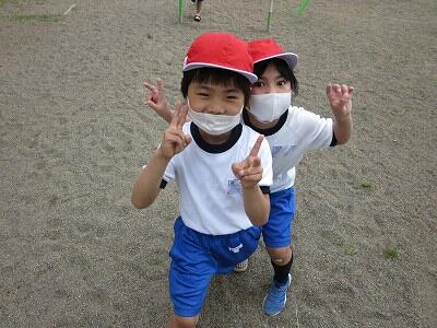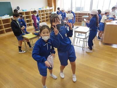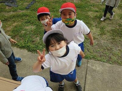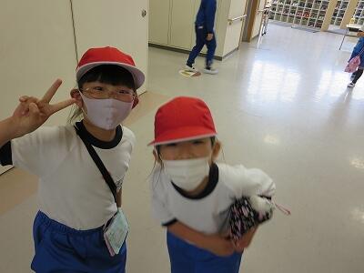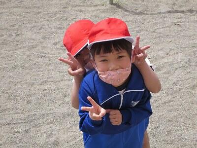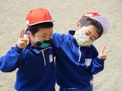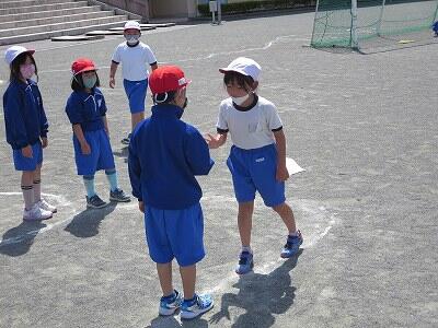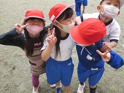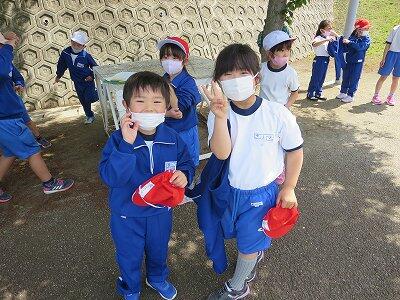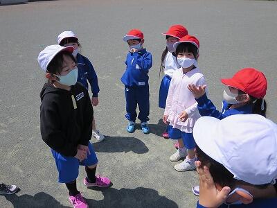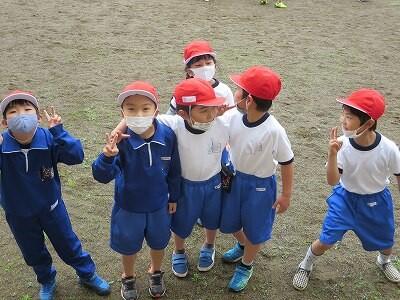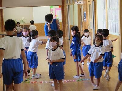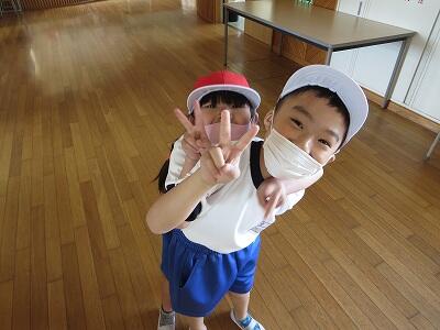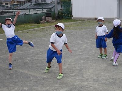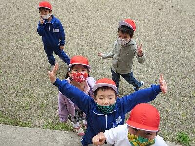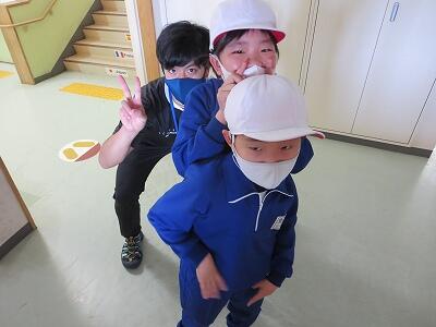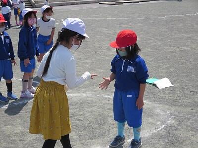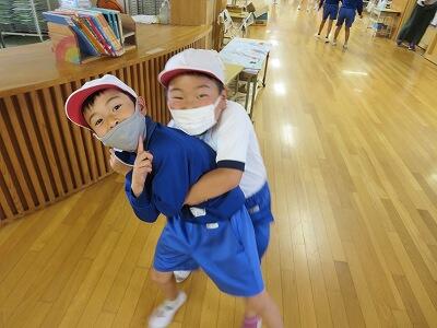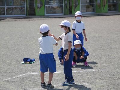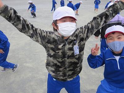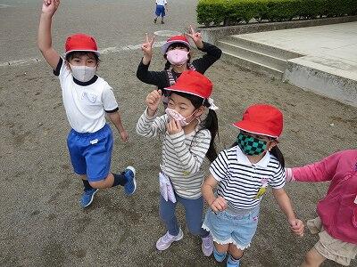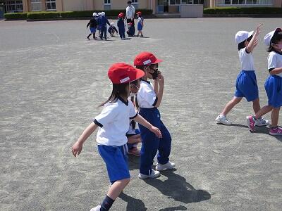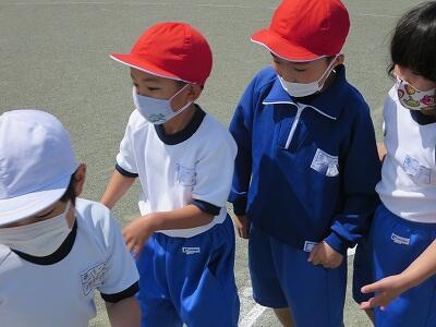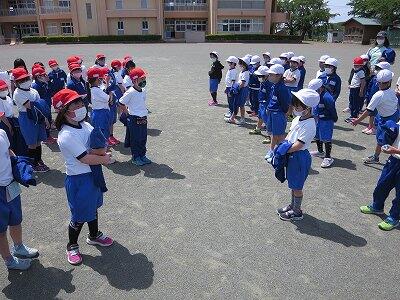 1年生を招待して、「へび鬼」「だるまさんの一日」「しっぽ取り」「震源地ゲーム」など、いろんな遊びで楽しみました。白帽子が2年生、赤帽子が1年生です。
