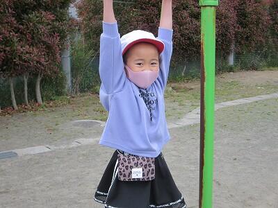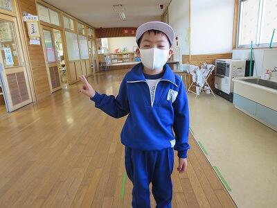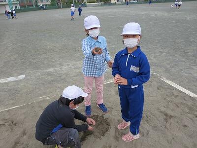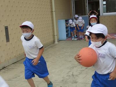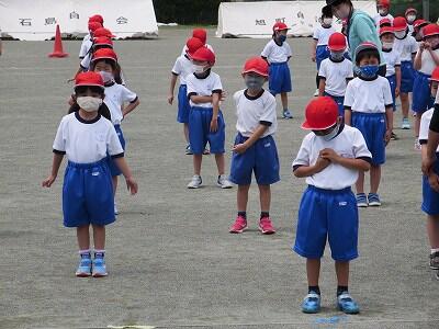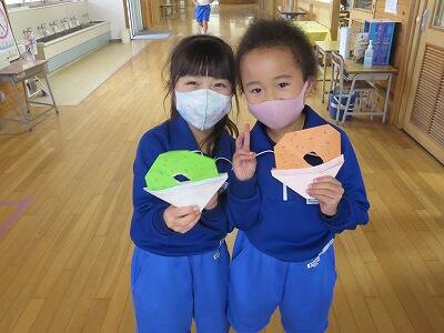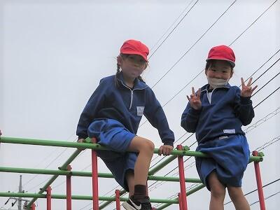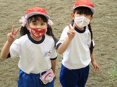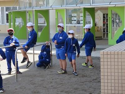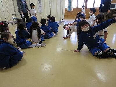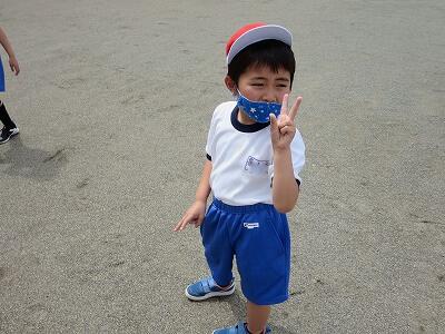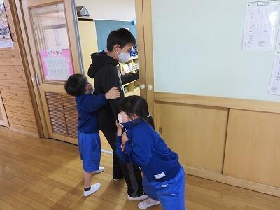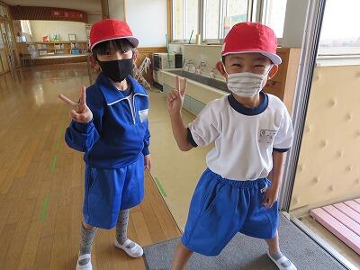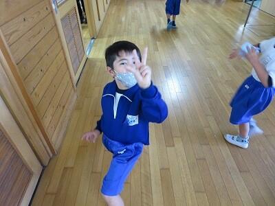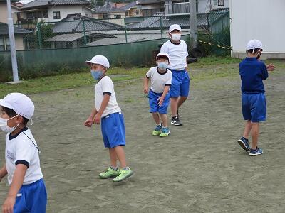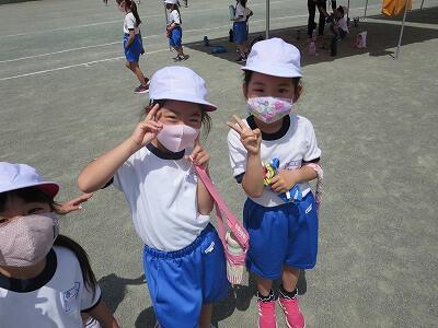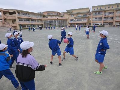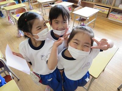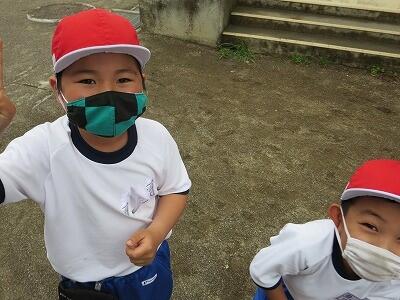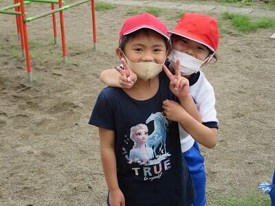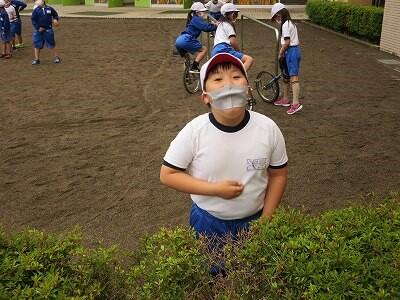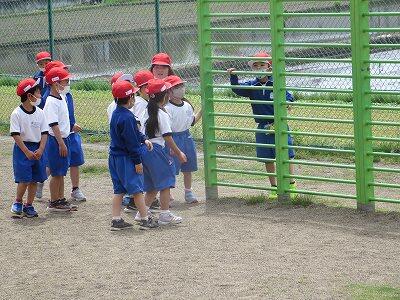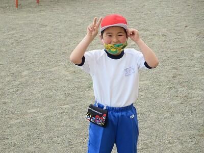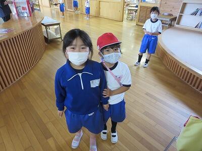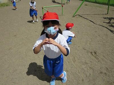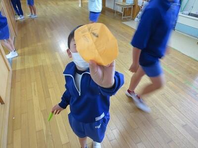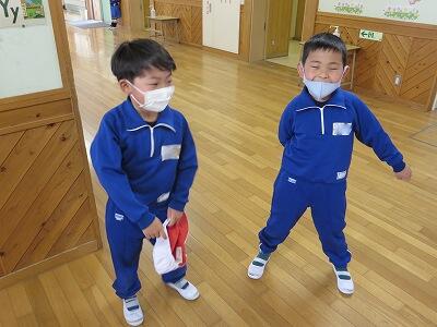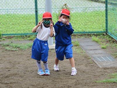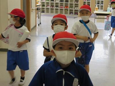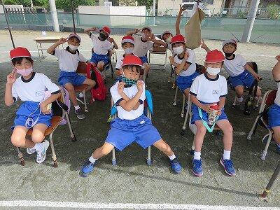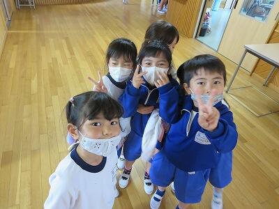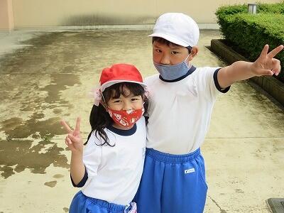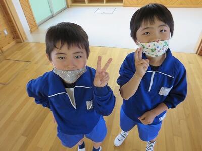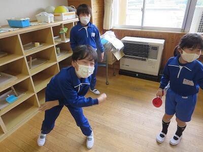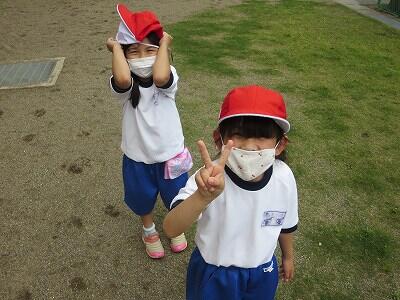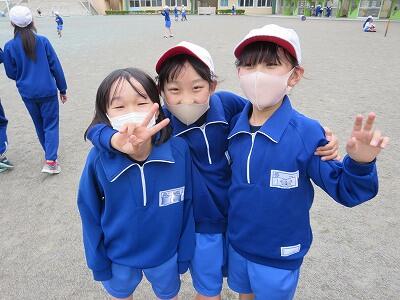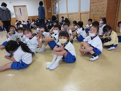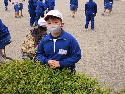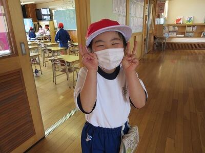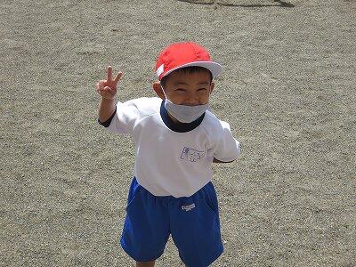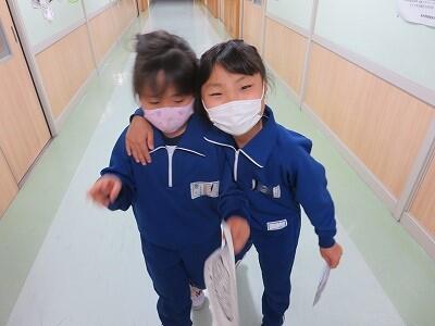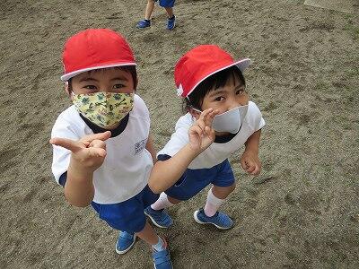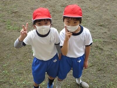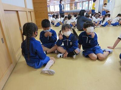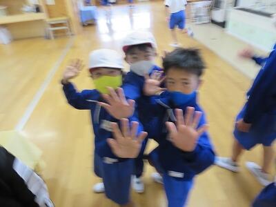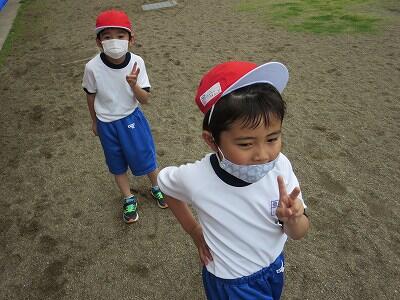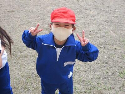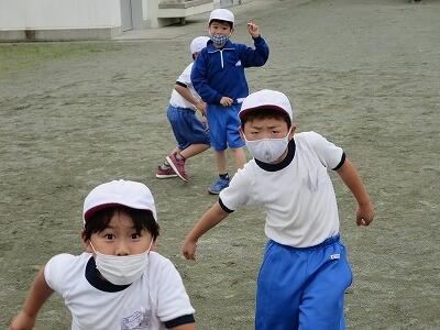 1年生を招待して、「へび鬼」「だるまさんの一日」「しっぽ取り」「震源地ゲーム」など、いろんな遊びで楽しみました。白帽子が2年生、赤帽子が1年生です。