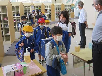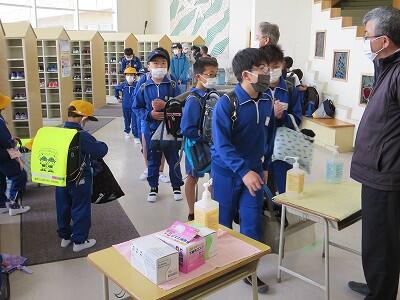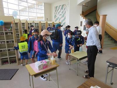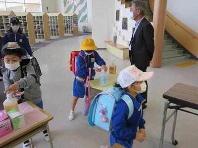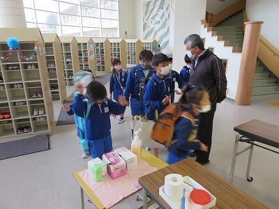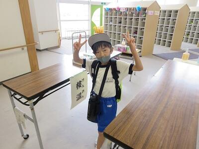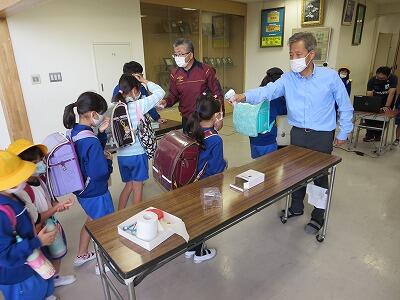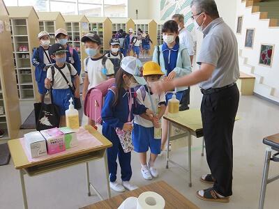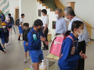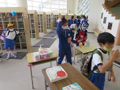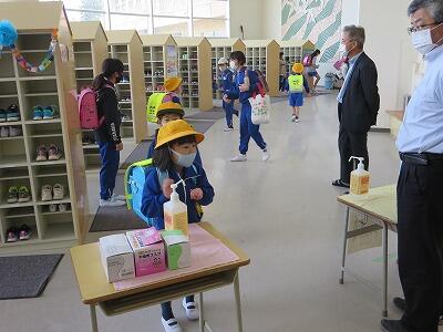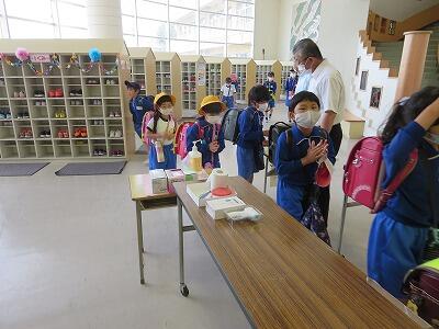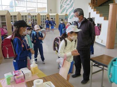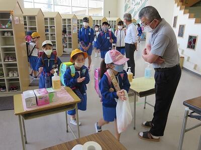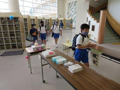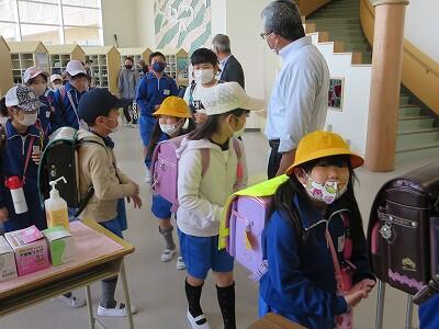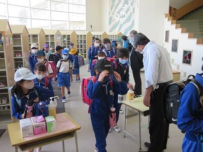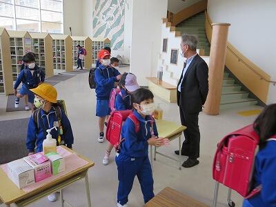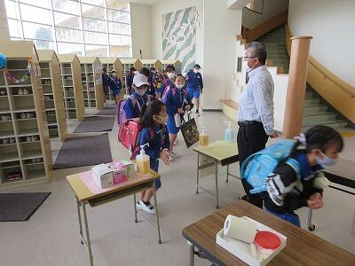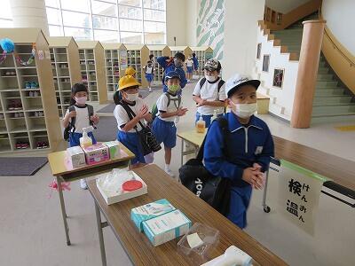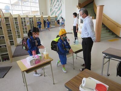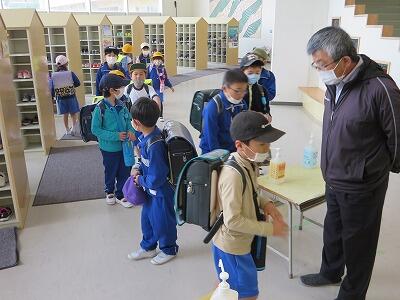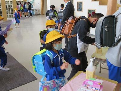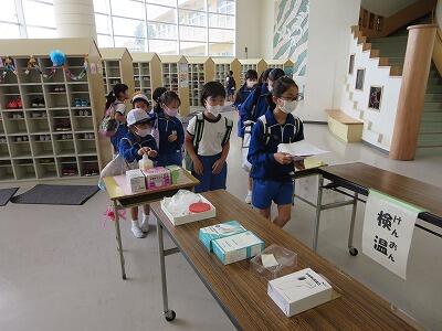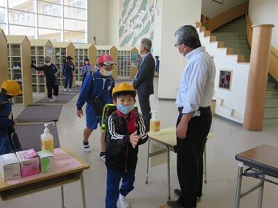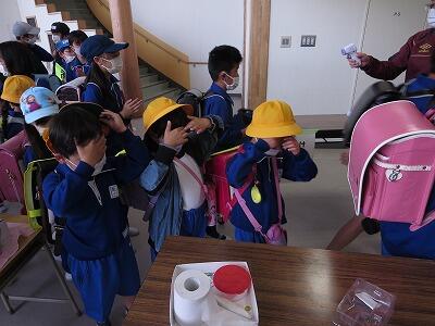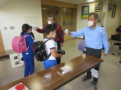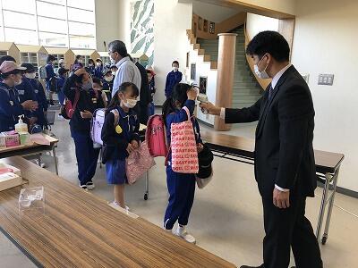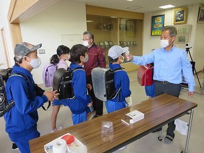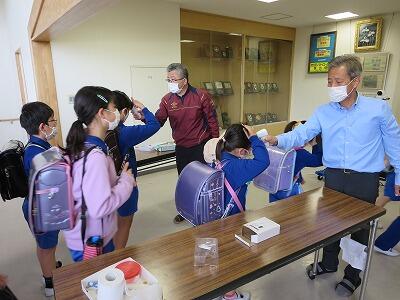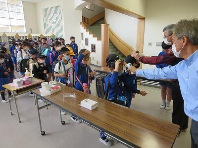 校長先生と教頭先生が、一人一人の体温検査をしています。