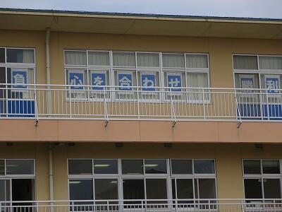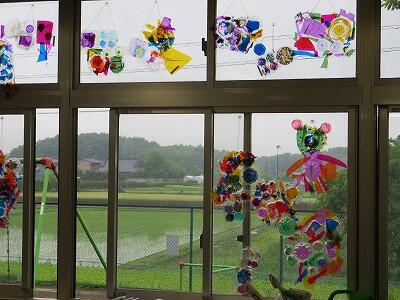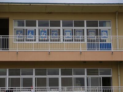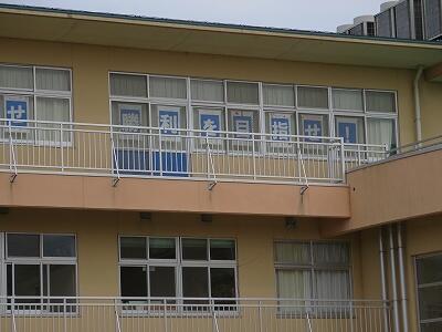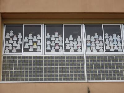 ふと上のほうを見ると、2階教室の窓に、たくさんのてるてる坊主が。