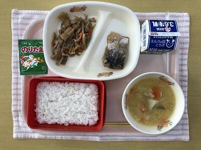 ごはん、牛乳、のりたま、さばのみぞれ煮、県産うどとごぼうのきんぴら、豆乳仕立ての野菜汁