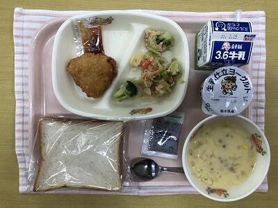 食パン、牛乳、いちごジャム、チキンカツ・ソース、野菜いっぱいサラダ、コーンポタージュ、県産生乳ヨーグルト