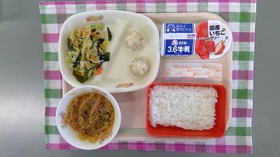 ごはん、牛乳、ショーロンポウ2ヶ、中華風わかめサラダ、麻婆春雨、国産いちごゼリー