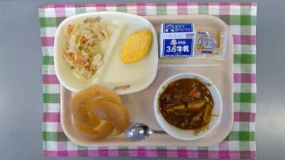 米粉パン、牛乳、みかんジャム、トマトミートオムレツ、大根とツナのサラダ、ビーフシチュー