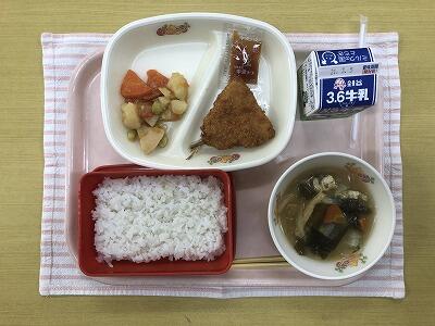 ごはん、牛乳、あじフライ・ソース、揚げボールと野菜のうま煮、みだくさん汁