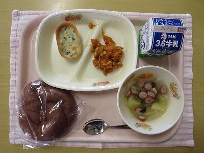 ココア米粉パン、牛乳、ホワイトグラタン、大豆のチリコンカン、フランクフルトと野菜の煮込みスープ