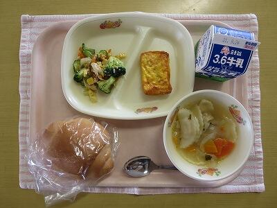 バターロール、牛乳、ハムチーズピカタ、スイートコーンのサラダ、ラビオリスープ