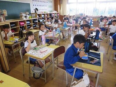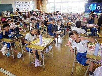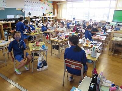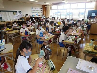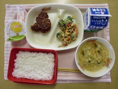 ごはん、牛乳、ハンバーグのきのこソース、カリカリサラダ、洋風卵スープ、お月見デザート
