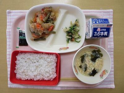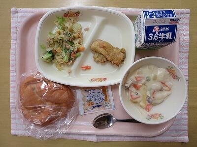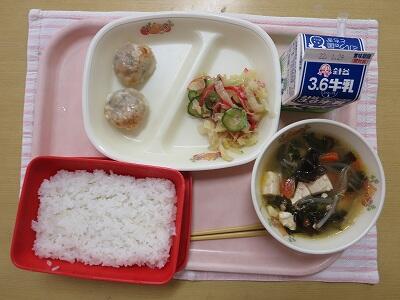 ごはん、牛乳、にらまんじゅう、かに風味サラダ、中華風スープ