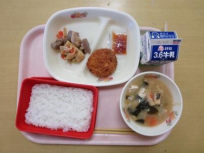 ごはん、牛乳、鮭とチーズのソフトカツ・小袋ソース、筑前煮、冬野菜のみそ汁