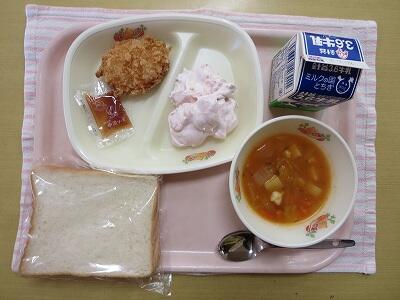 食パン、牛乳、フルーツサンドの具、えびカツ・小袋ソース、ミネストローネ
