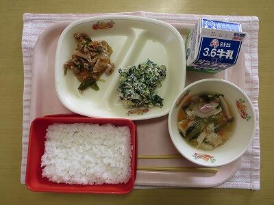 ごはん、牛乳、野菜入り焼き肉、ほうれん草とキャベツのツナ和え、ゆばのすまし汁