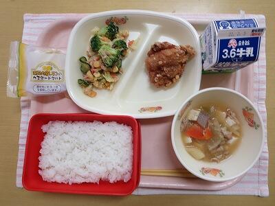 ごはん、牛乳、鶏肉のから揚げ、カリカリサラダ、豚汁、レモンタルト