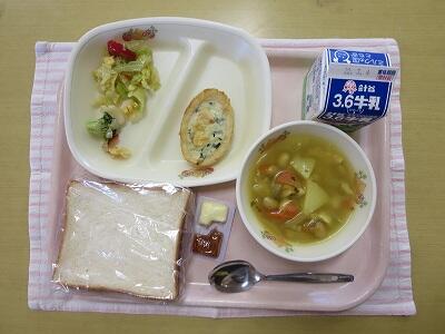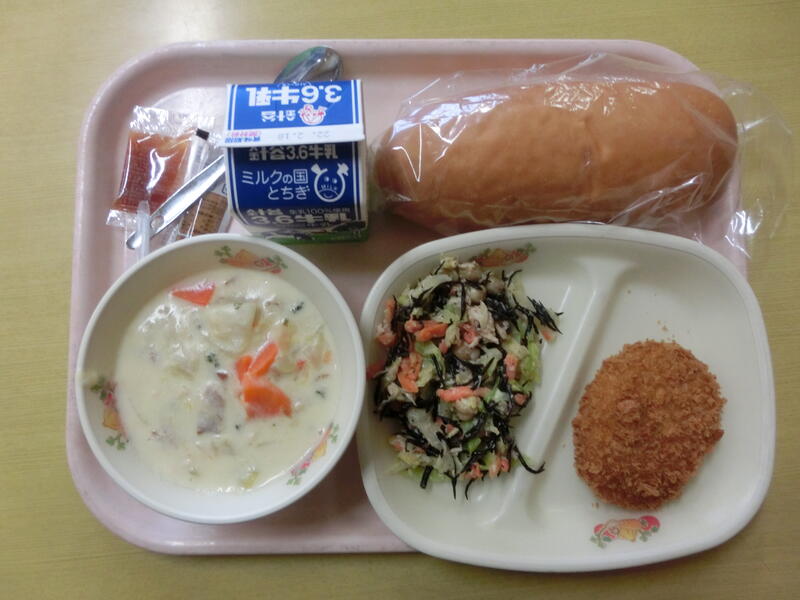コッペパン、キャラメルパテ、牛乳、県産豚肉コロッケ、小袋ソース、豆とひじきのサラダ、ホタテチャウダー