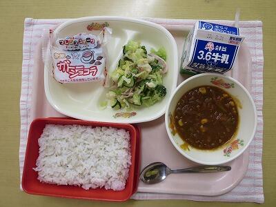 麦ごはん、牛乳、キーマカレー、グリーンサラダ、ガトーショコラ