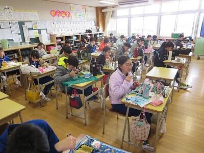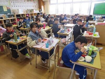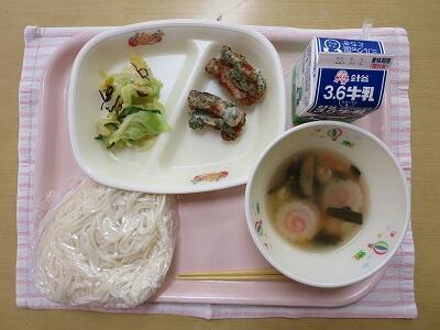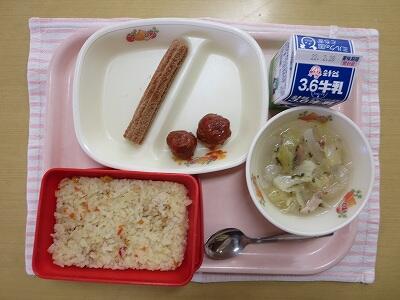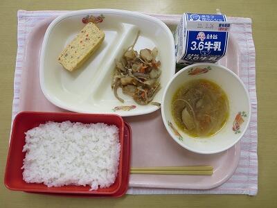 ごはん、牛乳、五目厚焼き玉子、県産うどのきんぴら、汁ビーフン
