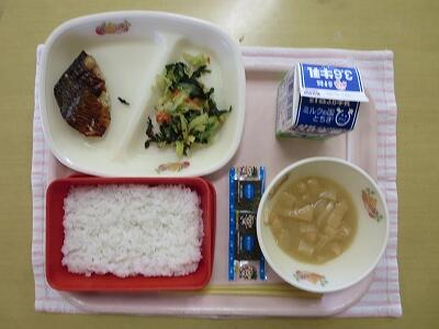 ごはん、味のり、牛乳、サバの幽庵漬け、ほうれん草のごま和え、じゃがいもとかんぴょうのみそ汁