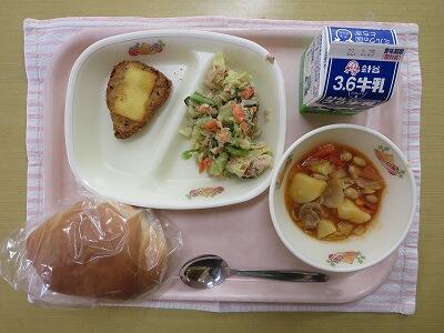 バターロール、牛乳、チキンのオーブン焼き、イタリアンサラダ、ポークビーンズ